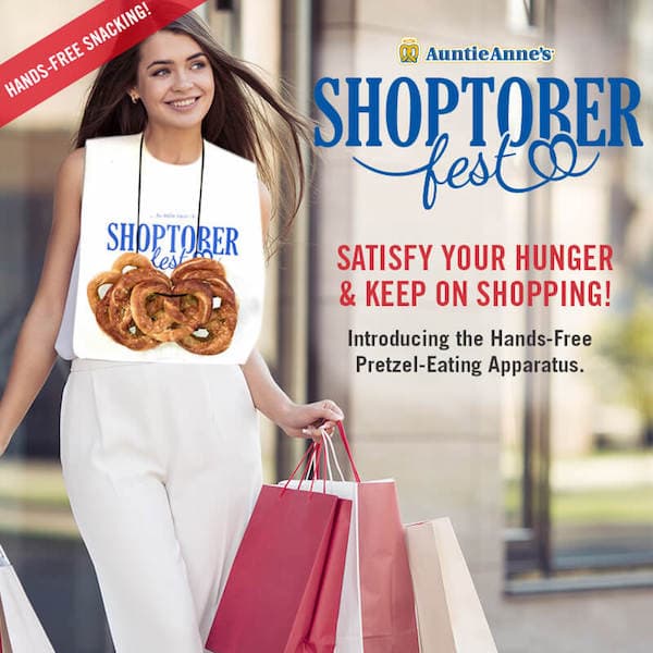Halloween costume shopping got you stressin’? Need to pick the perfect fall sweater, or want to get a jump start on your holiday gifts? Auntie Anne’s® invites you to kick off the fall with “Shoptoberfest,” a new holiday created specifically for shopping enthusiasts nationwide. To celebrate, from October 9 to October 14, pretzel fans can enjoy a “Buy One Get One” (BOGO) pretzel promotion through the My Pretzel Perks Mobile app to fuel their fall shopping adventures.In honor of Shoptoberfest, Auntie Anne’s is proud to announce the launch of its newest product, the fittingly named Hands-Free Pretzel-Eating Apparatus. Designed after a painstaking R&D process, this ingenious innovation lets shoppers enjoy an Auntie Anne’s pretzel while keeping their hands free for shopping bags or kid wrangling. The exclusive, limited edition shopping aid features a string necklace customized for Auntie Anne’s Pretzels and Pretzel Nuggets, as well as a bib to keep clothes butter-free. While the Hands-Free Pretzel-Eating Apparatus won’t be available for purchase, shoppers are encouraged to check out Auntie Anne’s social channels throughout Shoptoberfest for a chance to snag one.“Shopping will never be the same,” said Carol Pasquariello, vice president of marketing for Auntie Anne’s. “It’s as if Auntie Anne’s has given shoppers an extra hand, one designed precisely for the perfect shopping snack. You’re welcome, world.”